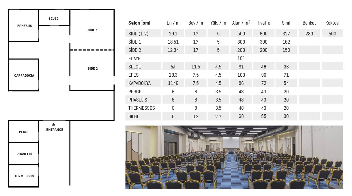 Ana salonumuz, 500 metrekarelik geniş bir alanda konuklarını ağırlamaktadır. Ayrıca, 7 adet workshop salonumuz da farklı gruplar için özel olarak tasarlanmıştır. Bu salonlar, daha küçük toplantılar ve çalışma grupları için idealdir.